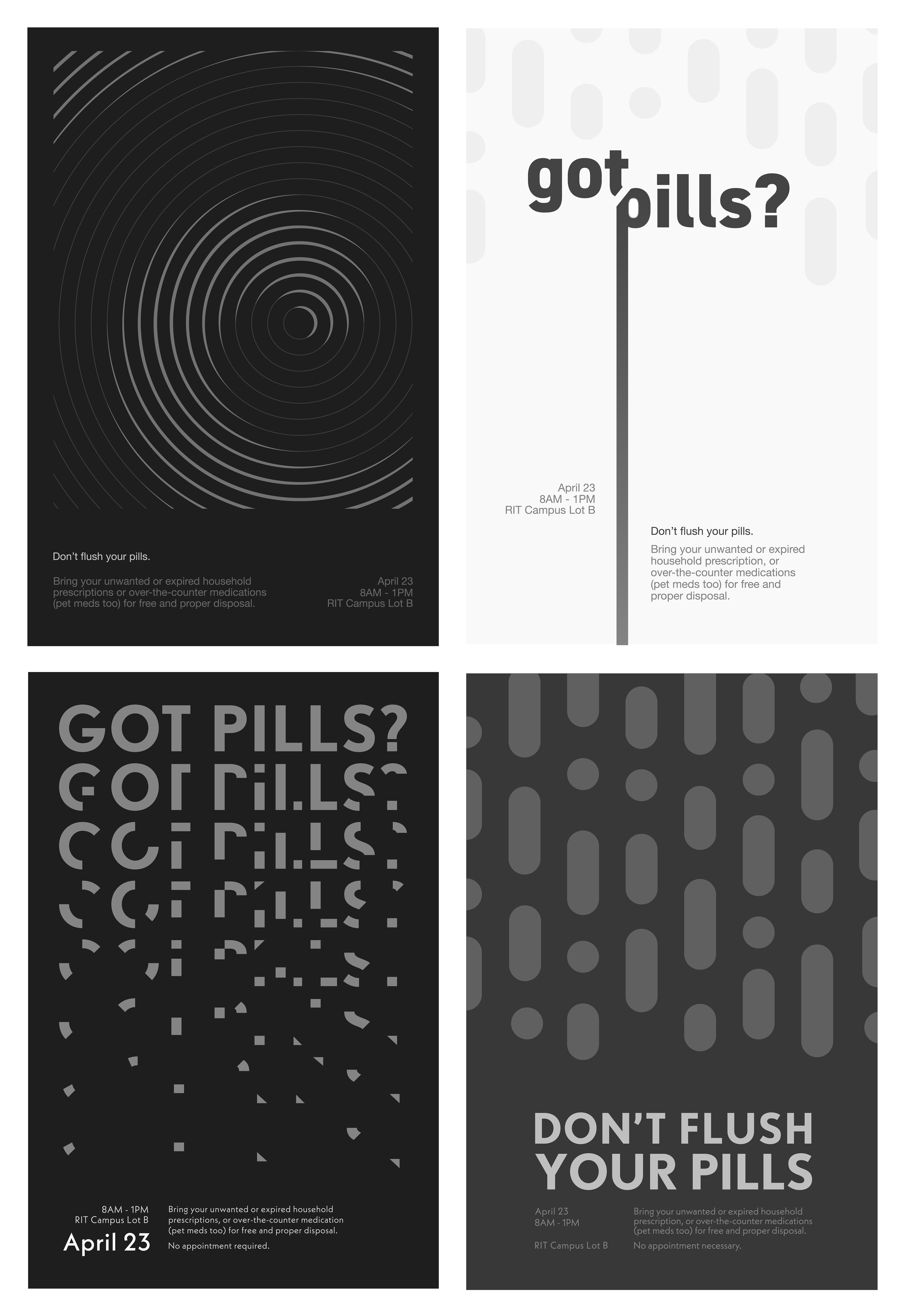 Series of poster iterations for a "Got Pills?" proper medication disposal drive.