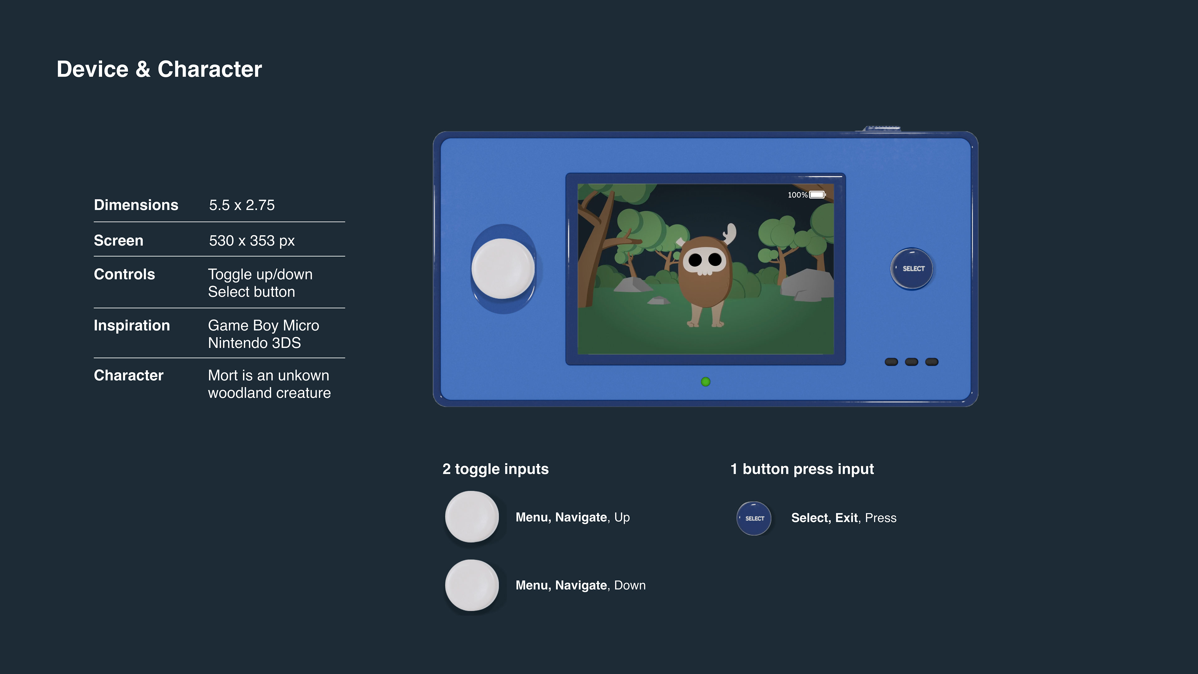 Goal: Combine skills in interaction, animation, and dimension. Use limited physical controls with a non-touch-enabled screen.