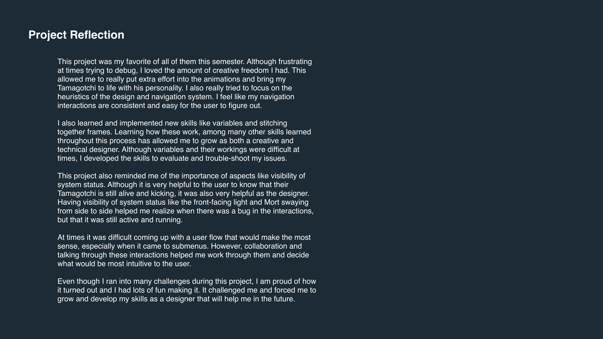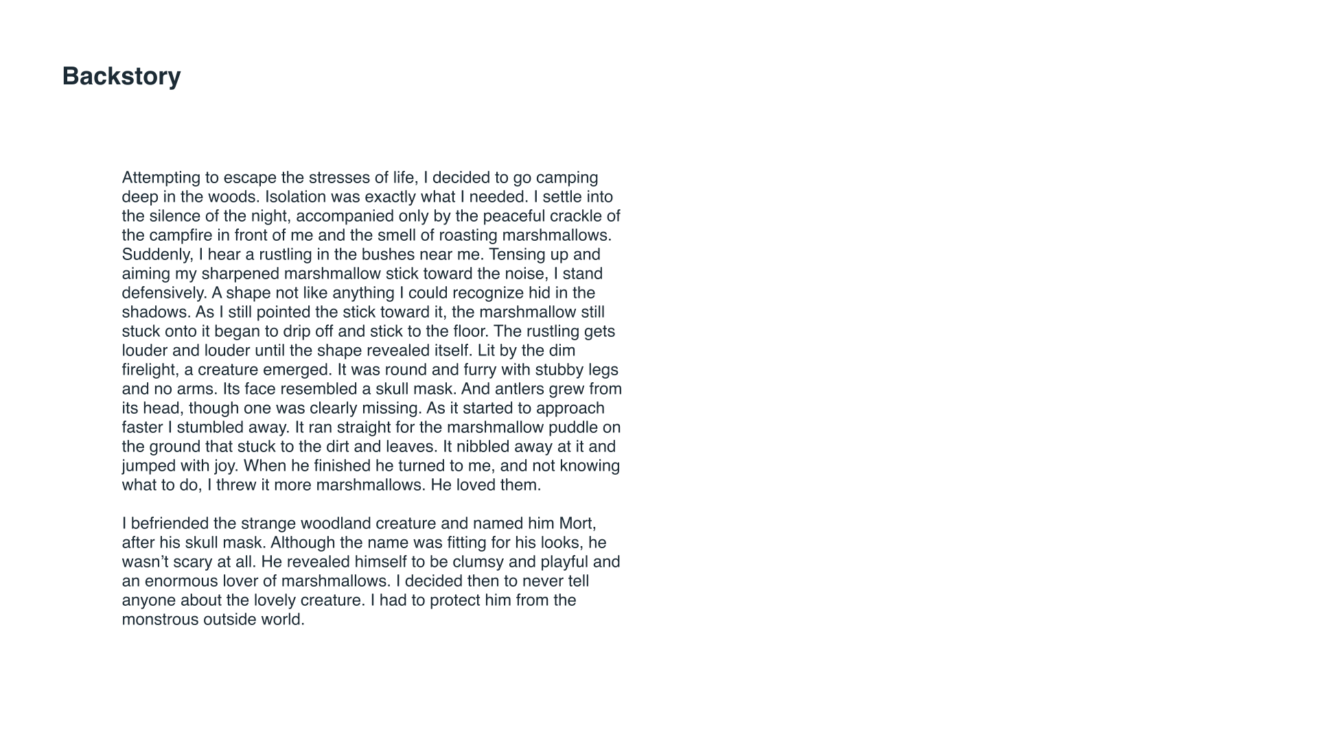 An original virtual pet care simulation game inspired by Bandai's Tamagotchi toy. "Mort" is an unknown woodland creature you find camping who's taken a liking to you. Make sure all of his needs are met to keep him alive.